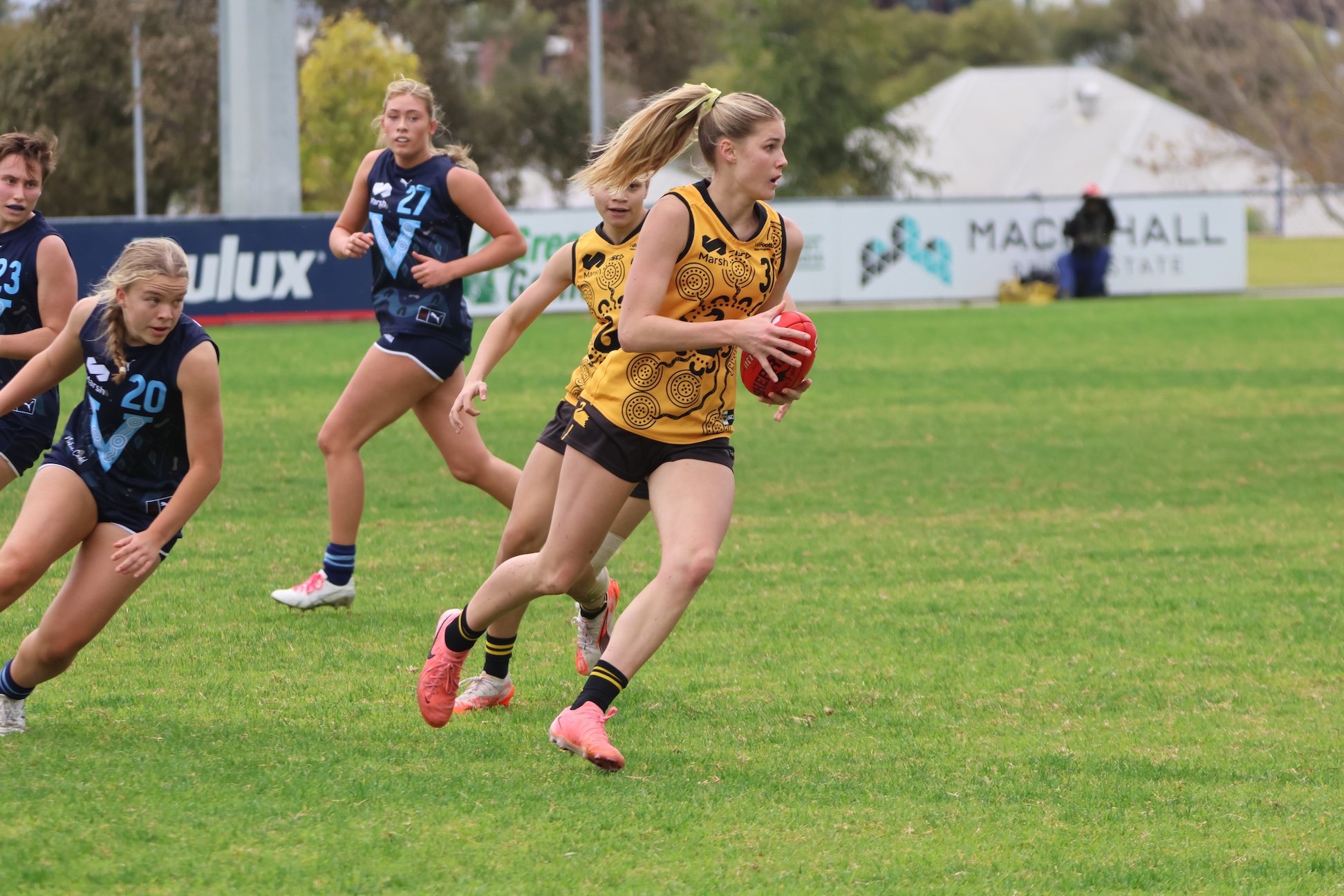 In the second half of the first term, Grigg moved into the onball group to try her luck at the coalface, and she did have an impact, winning the ball and sidestepping an opponent to kick inside 50 and clear from the forward half stoppage. Quite often under duress from the opposition aware of her explosive speed, Grigg was still able to get off a clean handball or a deft tap to keep the ball in motion.
